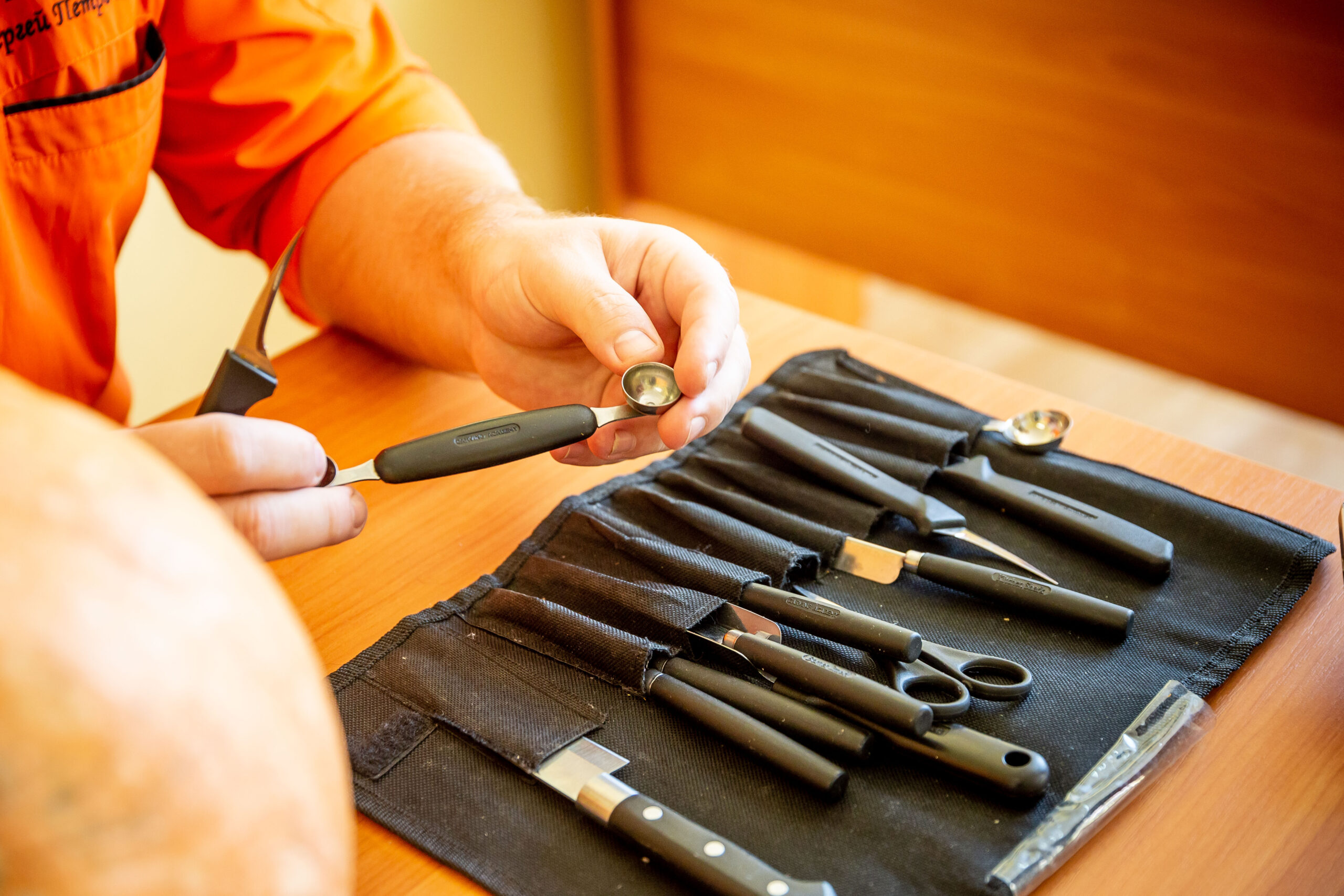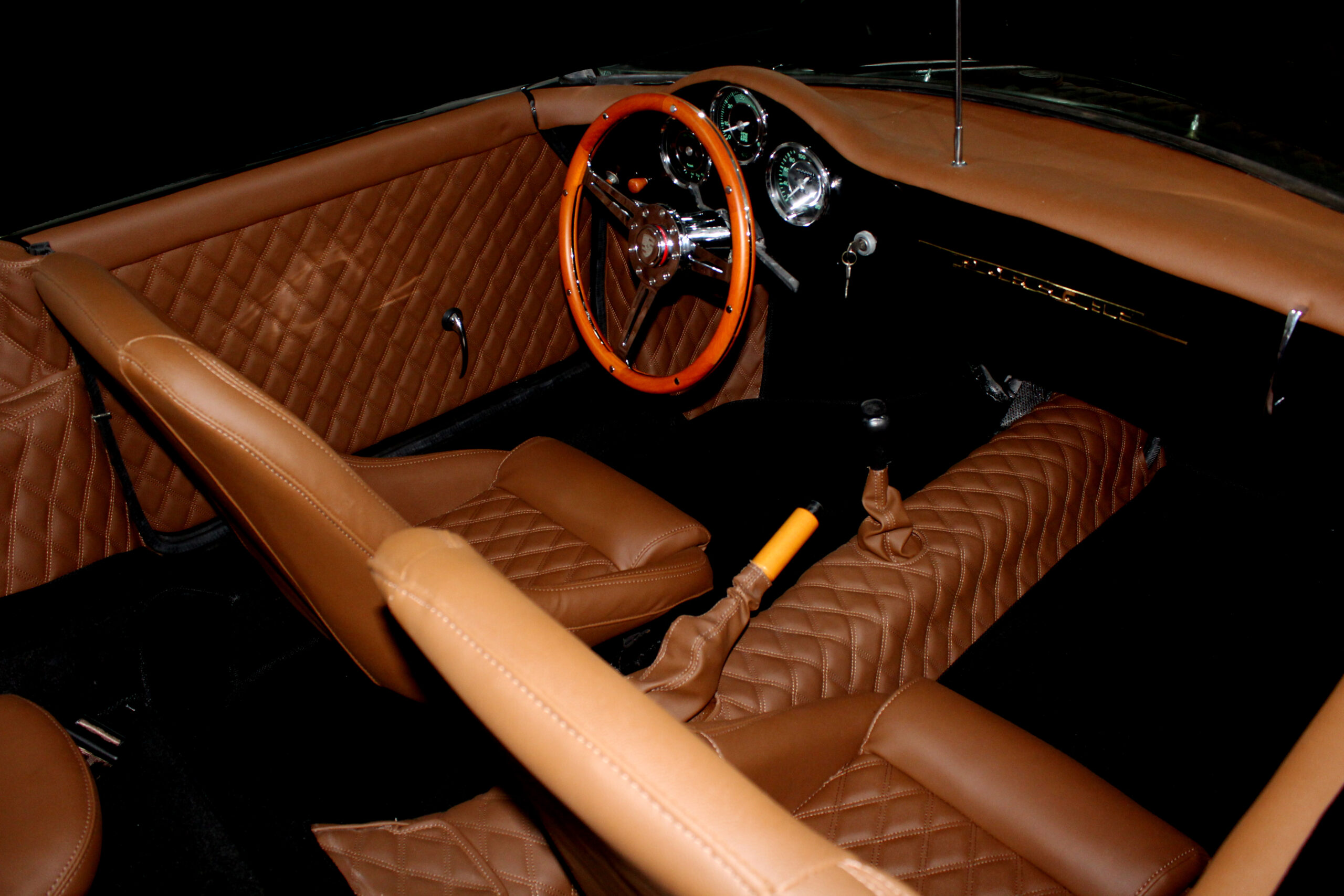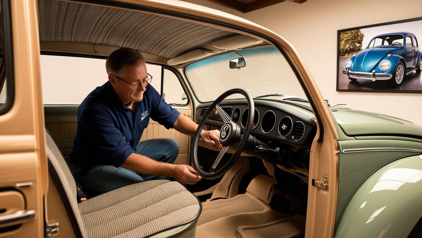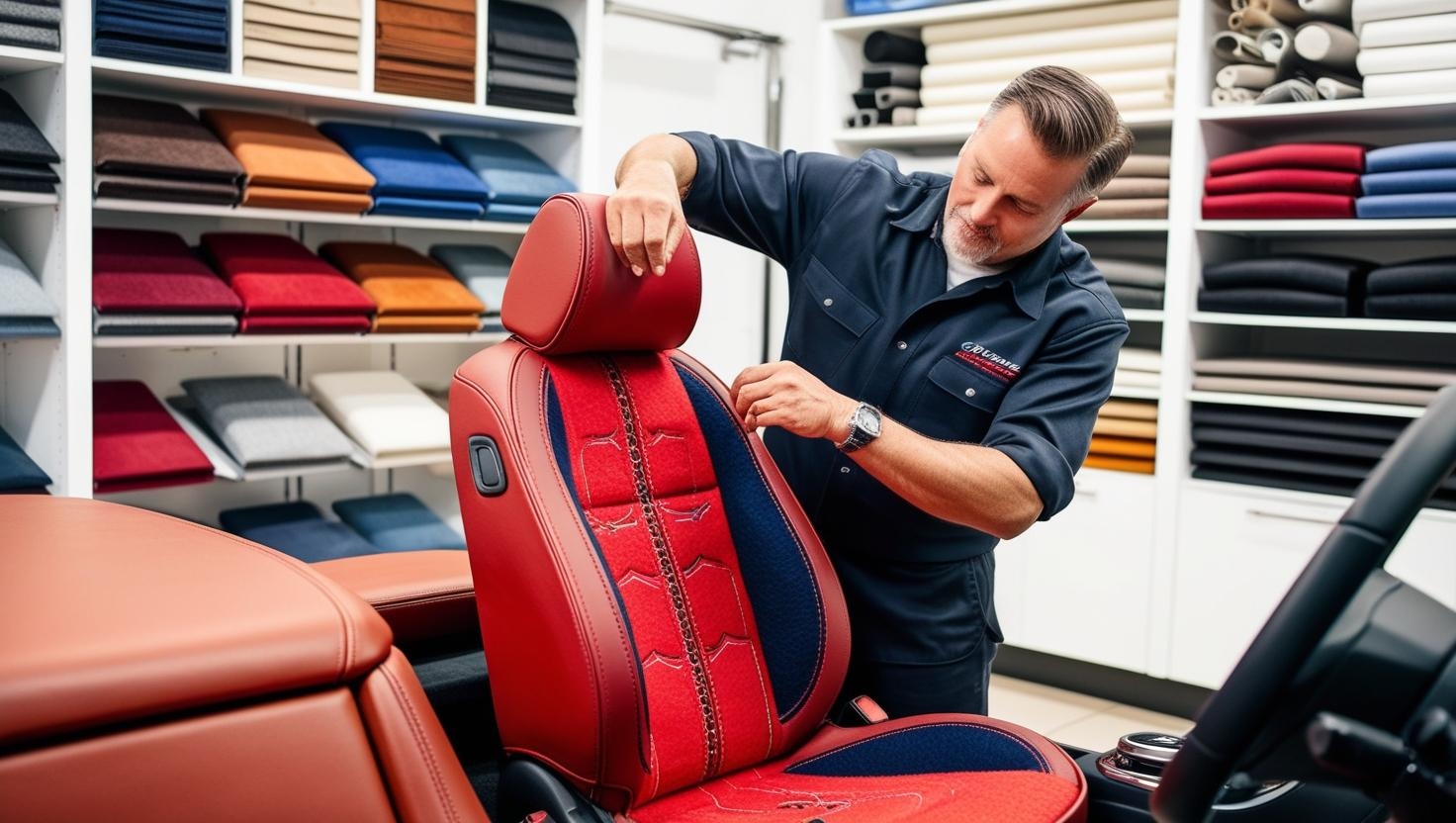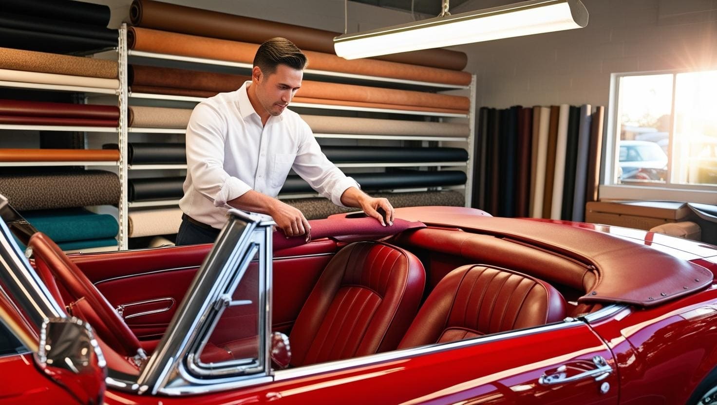 Uma oficina de tapeçaria automotiva iluminada, com um tapeceiro concentrado trabalhando no interior de um [...]